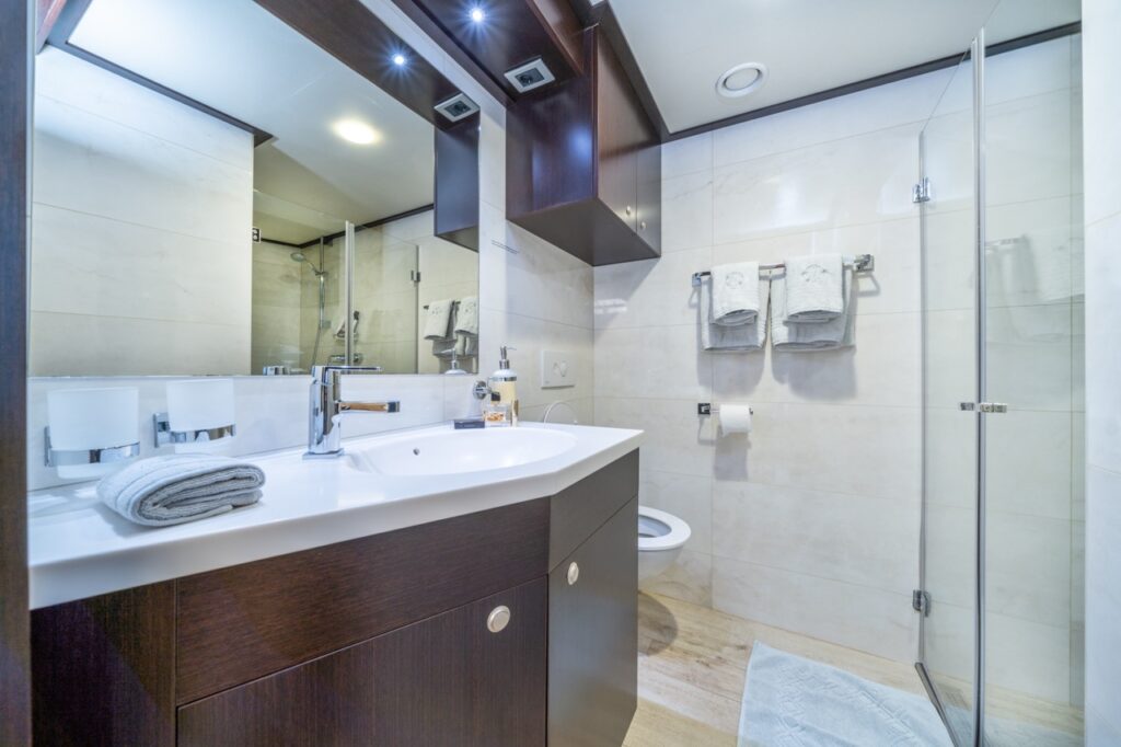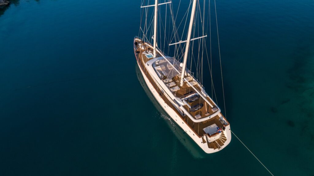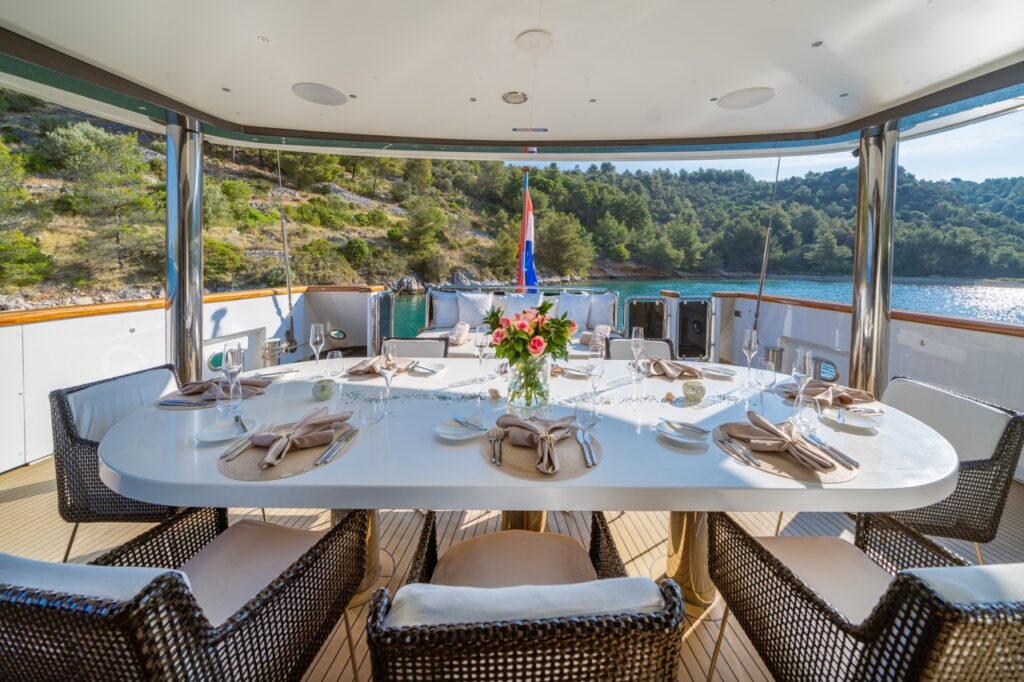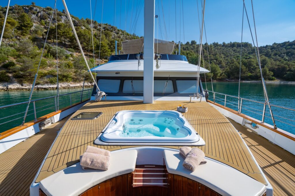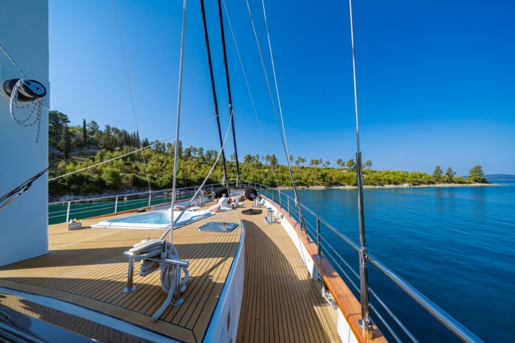 Outside, the yacht’s multiple deck spaces invite guests to soak up the beauty of the Adriatic. The sundeck features a large jacuzzi and sun loungers, perfect for long afternoons under the Mediterranean sun. The aft deck is ideal for alfresco dining, while the forward area offers additional lounging space with uninterrupted sea views. A wide swimming platform at the stern provides easy access to the sea and serves as a launch point for an impressive collection of water toys.