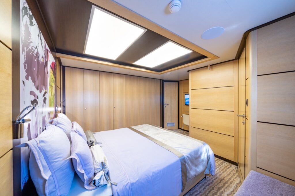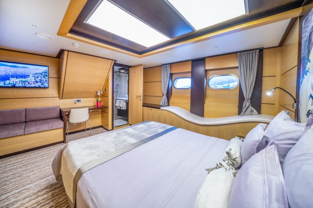 Navilux accommodates up to twelve guests in six spacious, air-conditioned cabins—five with king-size beds and one with twin beds—all with en-suite bathrooms and refined interiors. Designed with contemporary flair and warmth, the interior includes custom artworks by Croatian artist Mirna Sišul, giving the yacht a unique cultural touch. The main salon is open and inviting, offering a sophisticated lounge, dining area, and a well-stocked bar, all equipped with entertainment systems to make onboard living as comfortable as possible. Whether guests want to unwind in privacy or gather for shared moments, Navilux provides the perfect setting.