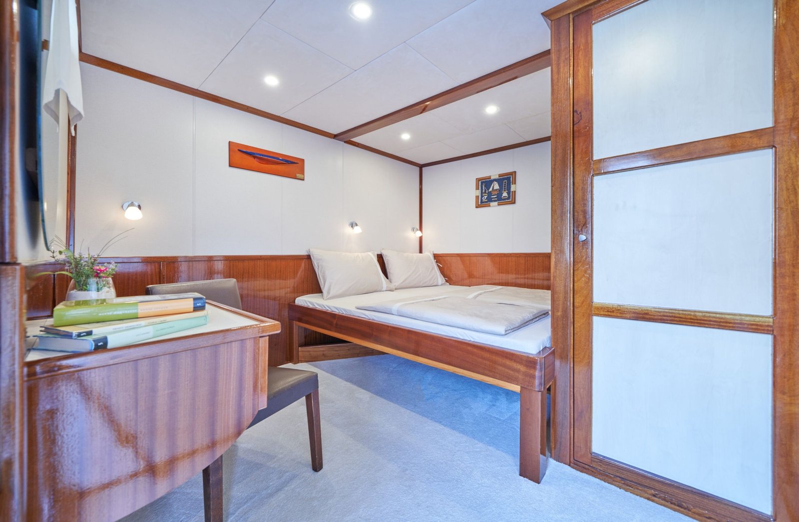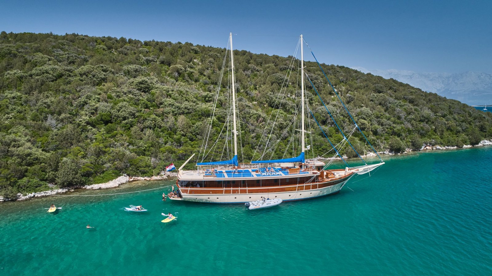 CHARTER FEE includes: Accommodation for 18 guests in 9 cabins, crew of 6 and their expenses, insurance, fuel for 4 h of engine work daily, generator work 24/7, fuel for tender transfers, use of recreational equipment (SUP, kayak, snorkeling gear), tourist taxes, Wi-Fi, VAT of 13%.